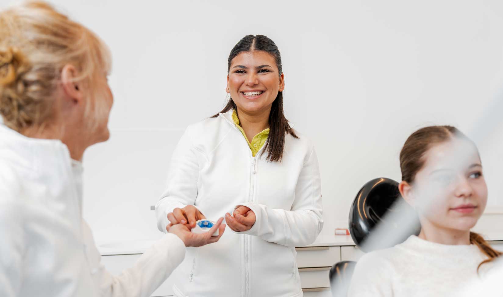 Ein Besuch in unserer kieferorthopädischen Praxis bedeutet für uns mehr als nur die eigentliche Behandlung. Vom freundlichen Empfang über die sorgfältige Vorbereitung der Behandlungsplätze, die individuelle Betreuung und Beratung bis hin zur Organisation im Hintergrund – jeder Schritt wird bei uns mit Leidenschaft durchgeführt. Wir sind stolz auf unser Team, das sich durch gegenseitige Wertschätzung und ein gemeinsames Ziel auszeichnet: das bestmögliche Ergebnis für unsere kleinen und großen Patientinnen und Patienten. Denn nur wenn sie unsere Praxis mit einem zufriedenen Lächeln verlassen, sind auch wir zufrieden.